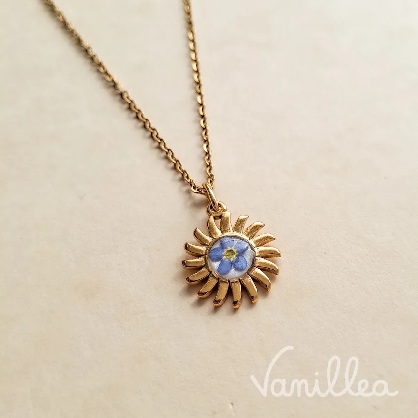 Le collier myosotis fleur naturelle doré est un bijou délicat qui met en lumière la beauté des fleurs naturelles. Son pendentif en forme de soleil entoure un véritable myosotis, créant un contraste subtil entre éclat doré et douceur florale.